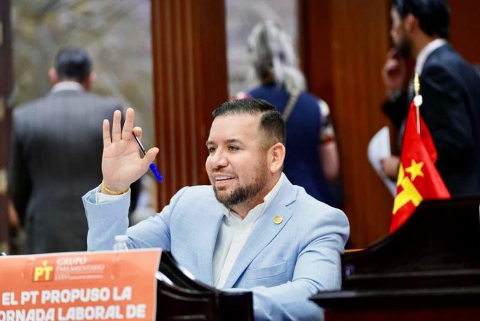 Morelia, Michoacán, a 27 de febrero de 2026.- “Hoy estamos muy contentos de anunciarles que en Michoacán votamos a favor del pueblo una vez más, que en el Grupo Parlamentario del Partido del Trabajo, votamos a favor de la reducción de la jornada laboral a 40 horas y esto, es una conquista más de la Cuarta Transformación y de todas y todos los trabajadores mexicanos ”, señaló el coordinador de la bancada del PT en el Congreso de Michoacán, Reyes Galindo Pedraza.