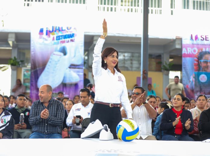 “Que estos tenis sirvan para caminar hacia nuestros sueños, y caminar siempre para adelante”, expresó la titular de la Secretaría de Educación del Estado (SEE), acompañada por el alcalde de este municipio, Eric Gaona García.